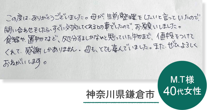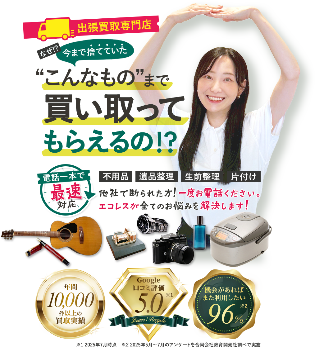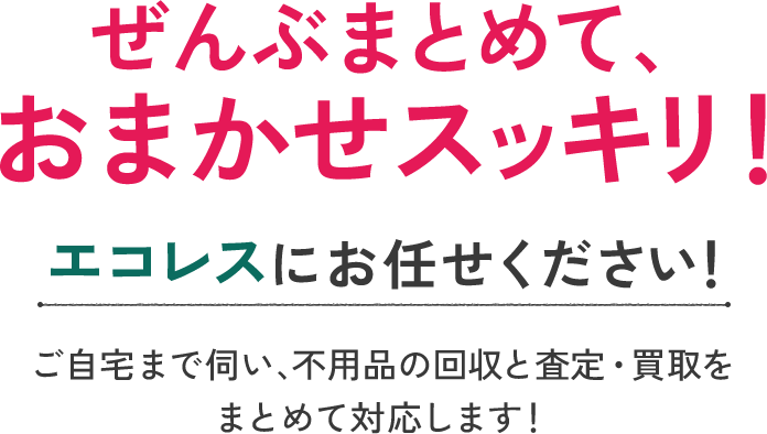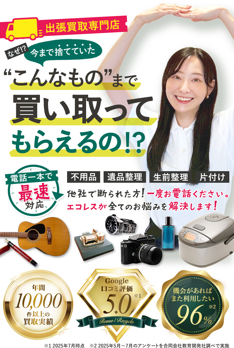 買取可能なものは高価買取し、再利用できない不用品は回収処分までまとめて対応可能です。遺品整理・生前整理での一括対応をご希望のお客様にご好評いただいています。