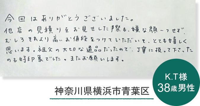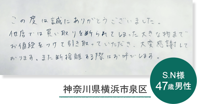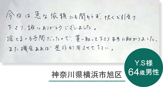 横浜市旭区・泉区・青葉区・神奈川区・西区・保土ヶ谷区などを中心に、神奈川県全域で出張買取に伺っております。まずはお気軽にご相談ください。