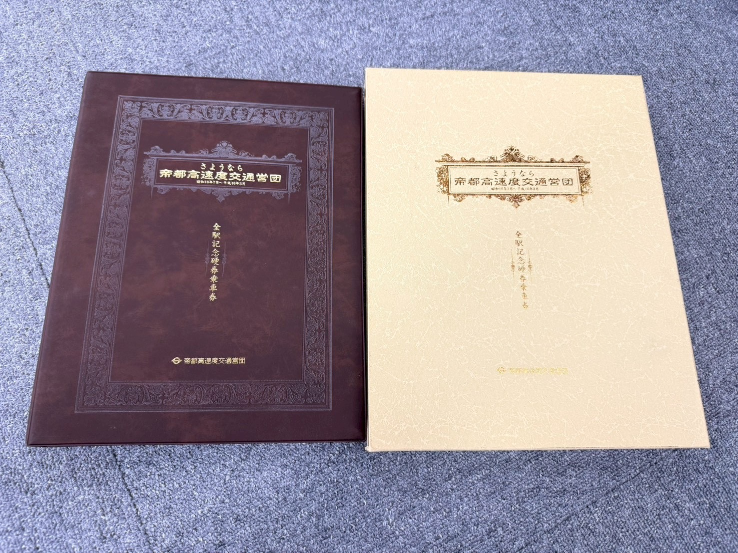 2004年4月1日、帝都高速度交通営団は民営化により東京地下鉄株式会社(東京メトロ)に引き継がれ、72年の歴史に幕を閉じました。この「さようなら営団地下鉄」キャンペーンでは、さまざまな記念グッズが発行され、特に全駅記念硬券乗車券は人気を集めました。硬券(紙製の切符)は、自動改札普及以前の鉄道の象徴で、全駅分を収めた記念本はコレクターアイテムとして価値が高いです。茶色表紙とクリーム色表紙の2冊セットは、発行部数が限定されており、表紙の豪華な装丁(金文字・装飾枠)と内頁の硬券が、鉄道史の資料として重宝されます。