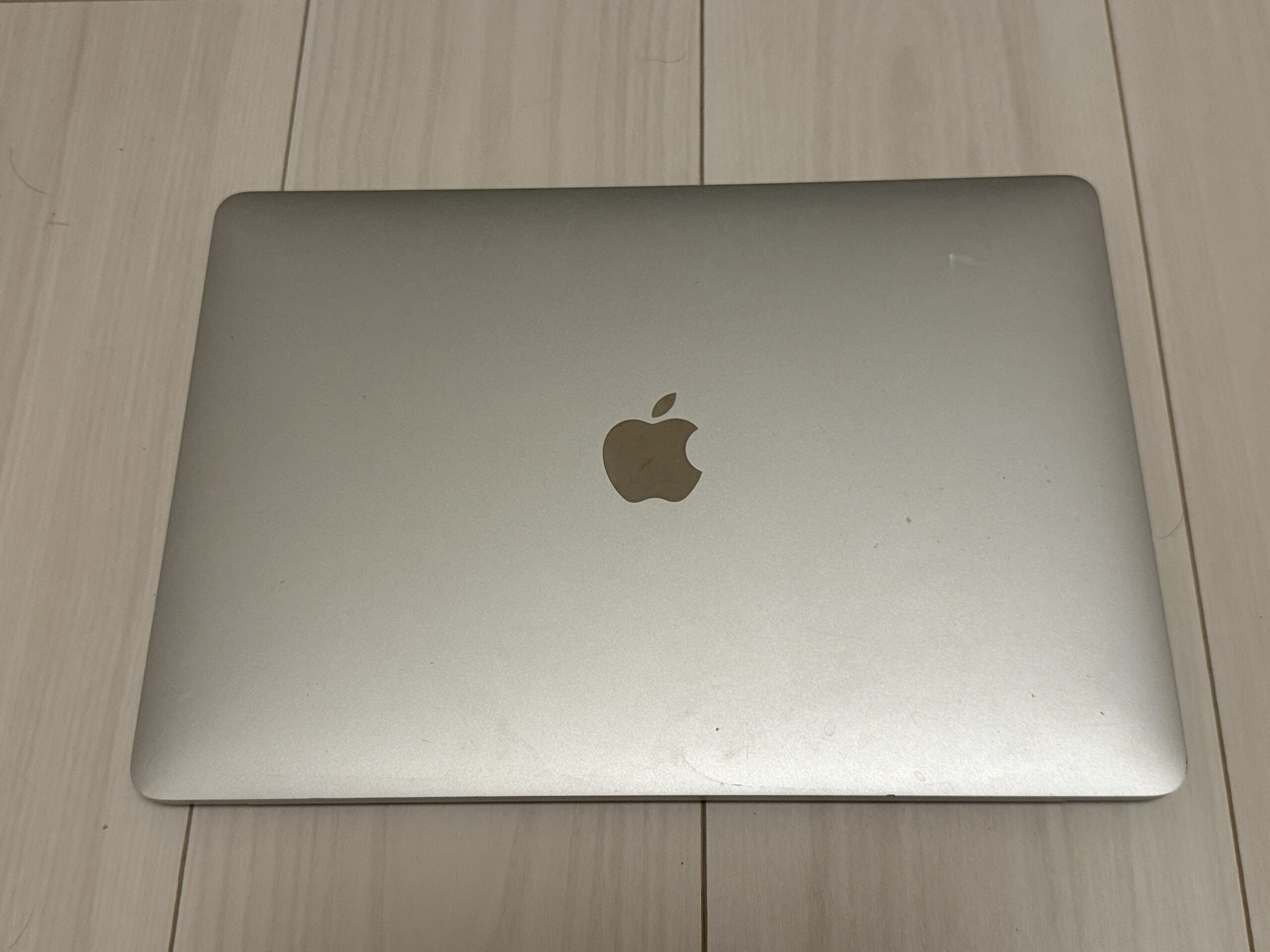 蓋のAppleロゴについては、2006〜2015年頃のモデルでバックライト発光式(リンゴが光るアイコン)が特徴でしたが、2016年以降のモデル(特にRetina薄型化以降)では非発光の鏡面仕上げ(金色調の鏡面Appleロゴ)に変更。薄型化とバッテリー効率向上のため、発光を廃止したのが理由です。シルバー/スペースグレイのカラー展開は2016年頃から本格化し、スペースグレイは「プロフェッショナルで落ち着いた印象」として人気。写真の金色調ロゴは、シルバー/スペースグレイの鏡面仕上げで光の反射により金色に見える典型例です。
