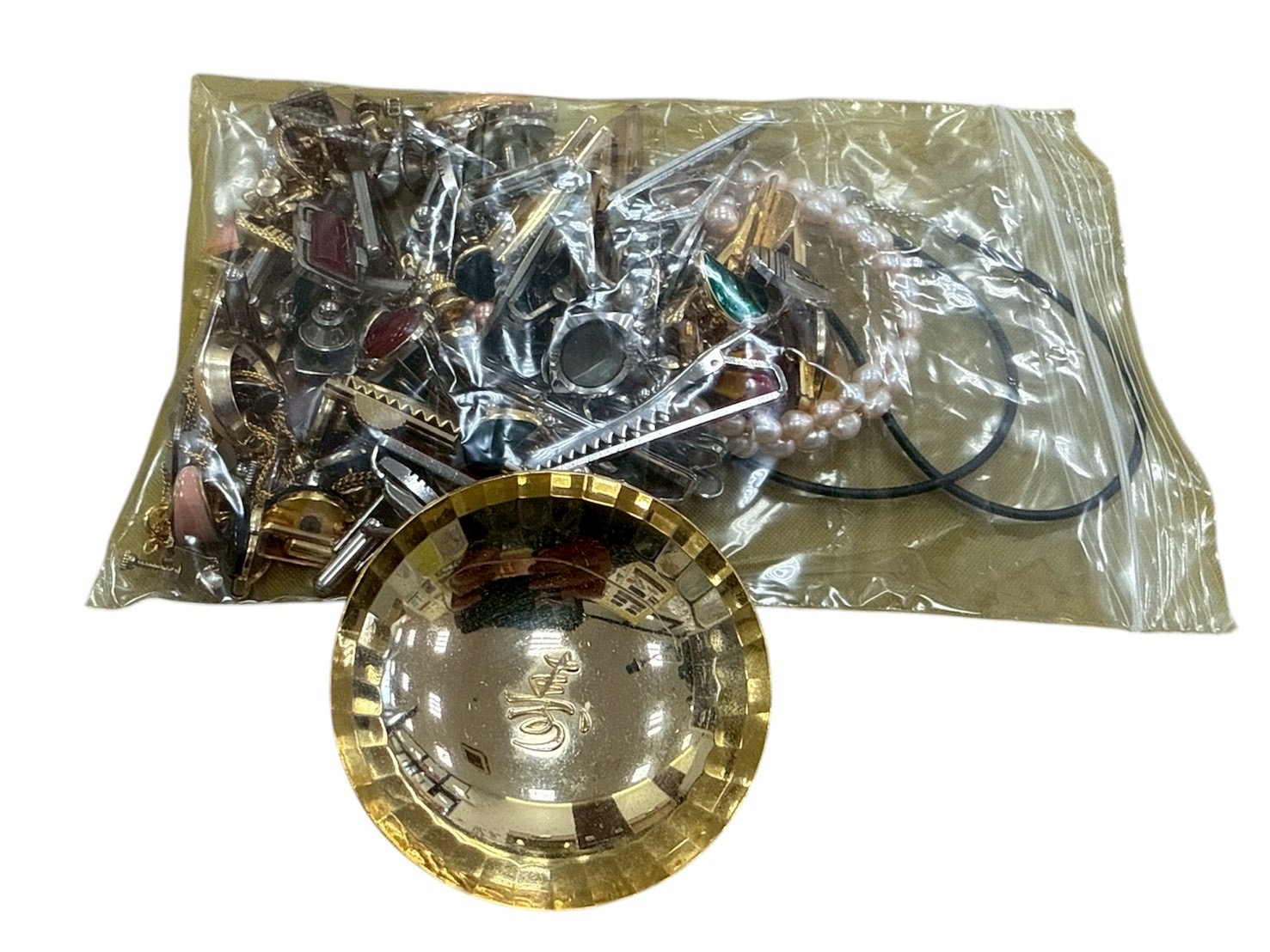 透明のビニール袋にぎっしり詰まったブローチ、ネックレス、リング、ピアス、タイピンなどのジュエリー類と、刻印入りの金色小皿。状態は使用感がありますが、宝石の輝きや金属光沢が残っており、高価買取を実現いたしました!