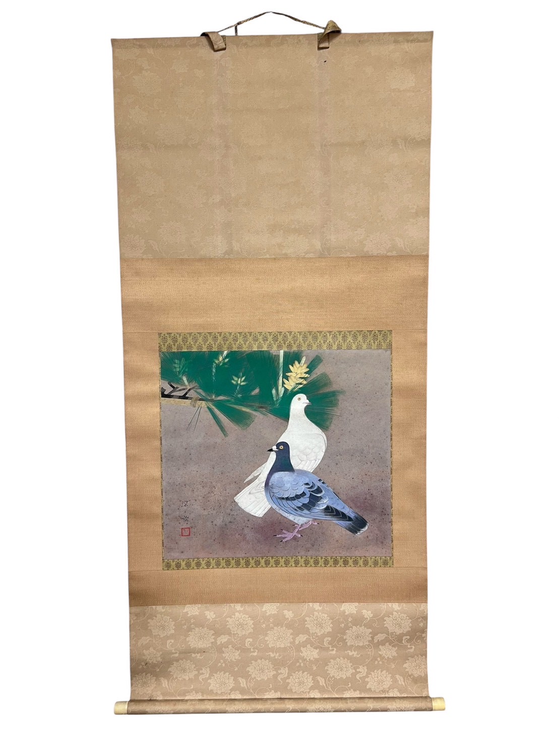 松の枝に二羽の鳩が描かれた日本画の掛軸です。